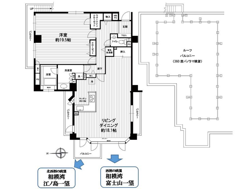 | 特徴 | オーシャンフロント!リビング・浴室より相模湾・富士山・江ノ島まで一望! 360度パノラマ眺望が魅力の屋上ルーフバルコニー付 ペット飼育可能(規約による制限あり) |